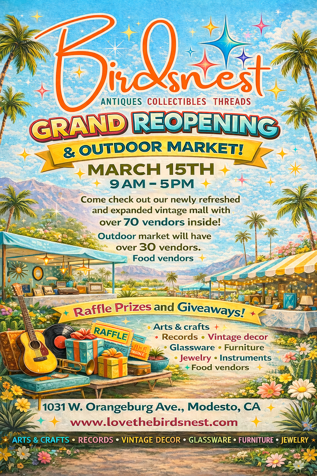 Our Outdoor Markets are a vibrant extension of The Birdsnest experience! Held in our parking lot and outdoor spaces throughout the year, these markets bring together a rotating mix of antique dealers, vintage vendors, artisans, collectors, and small businesses for a fun, community-focused shopping experience.