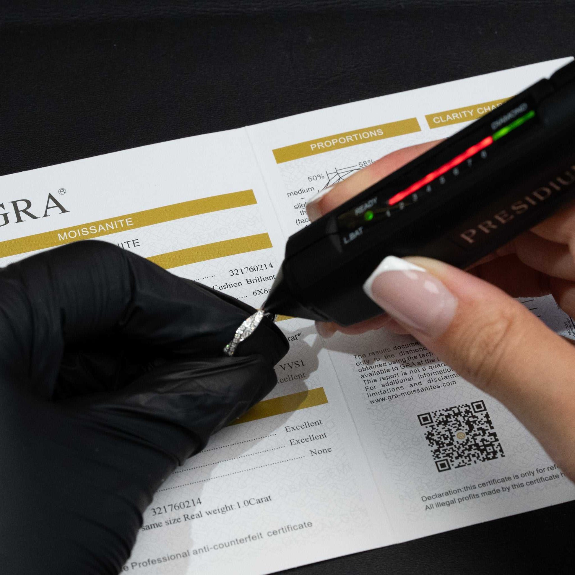 Each ring comes with moissanite certificate report. Our moissanite passes the diamond tester.