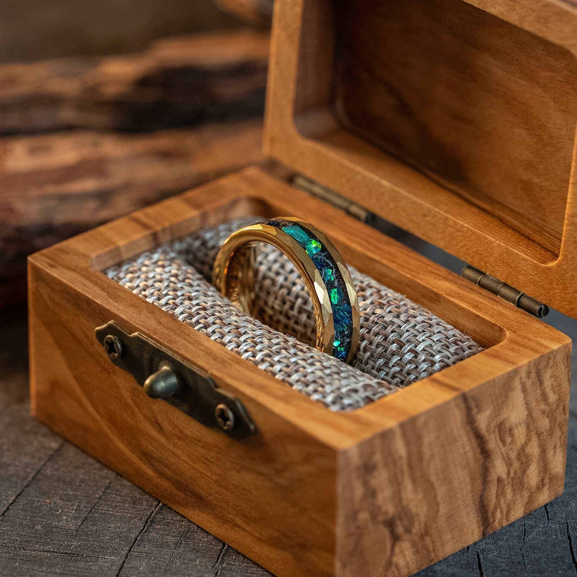 Ideal as a women’s tungsten ring, a women’s unique engagement ring, or a standout wedding band, this hammered gold tungsten carbide ring combines strength with unparalleled style. Its comfort-fit design ensures all-day wear, while the fusion of green opal jewelry and meteorite creates a captivating, one-of-a-kind look for those who crave bold, celestial accessories. Handcrafted with precision, each ring arrives in a luxurious olive box, perfect for proposals, anniversaries, or gifts.
