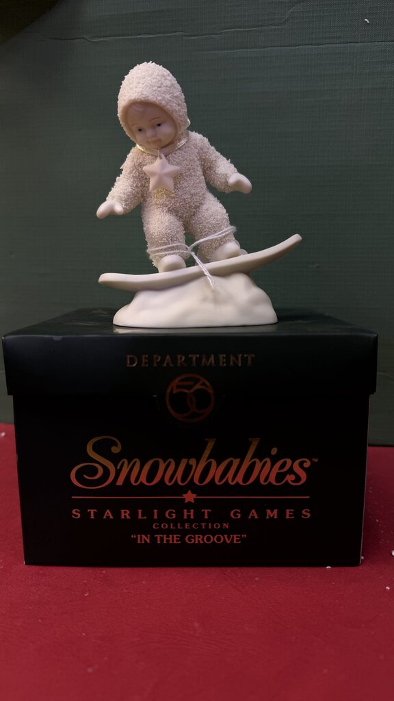 This collectible Snowbabies Starlight Games figurine titled 'In The Groove' features a delightful winter scene, perfect for adding charm to your holiday decor. A must-have for collectors of Snowbabies and winter-themed decorations.